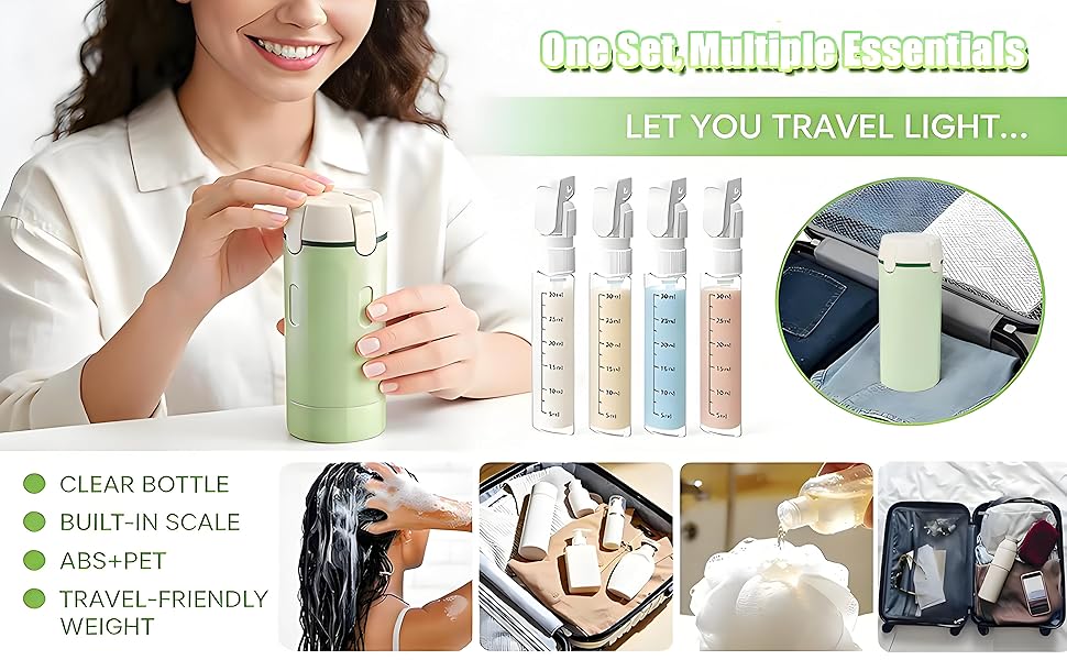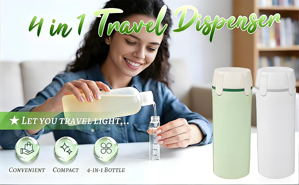 【Leak-proof Design】 4-in-1 travel dispensing bottles feature a multi-layer sealed internal structure and a safety locking mechanism to prevent leakage. Each bottle is equipped with an individual cap, ensuring the safety and leak-proofness of your liquids.