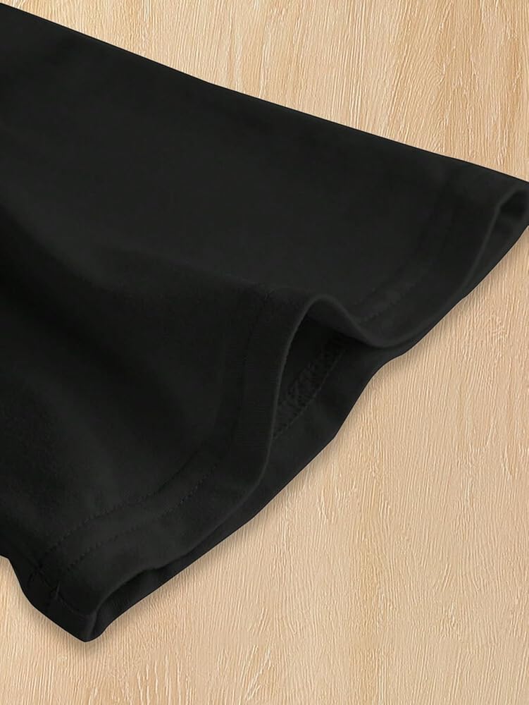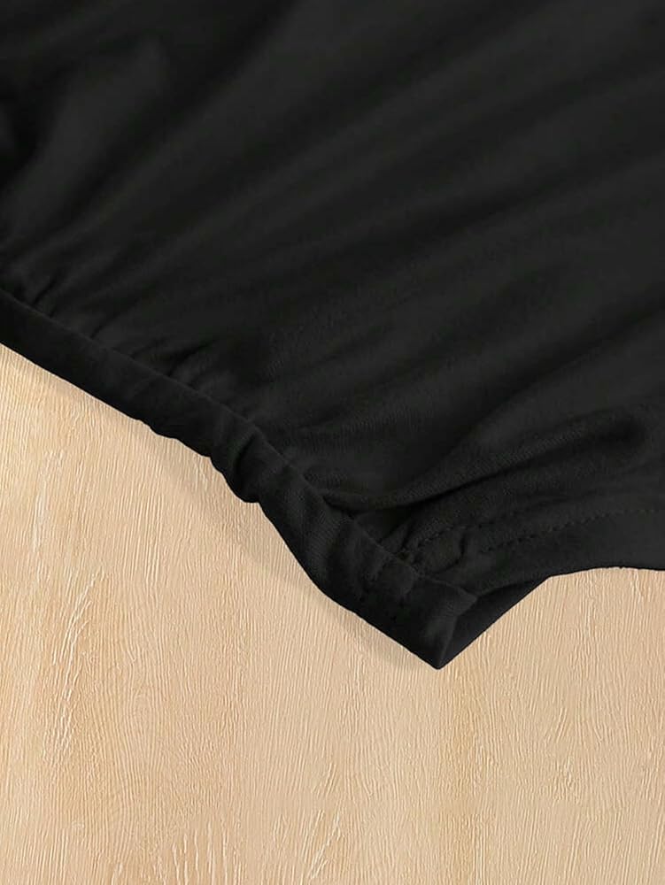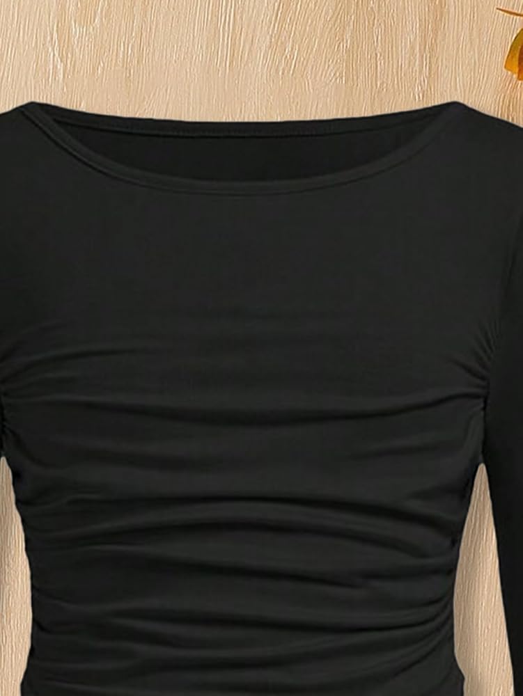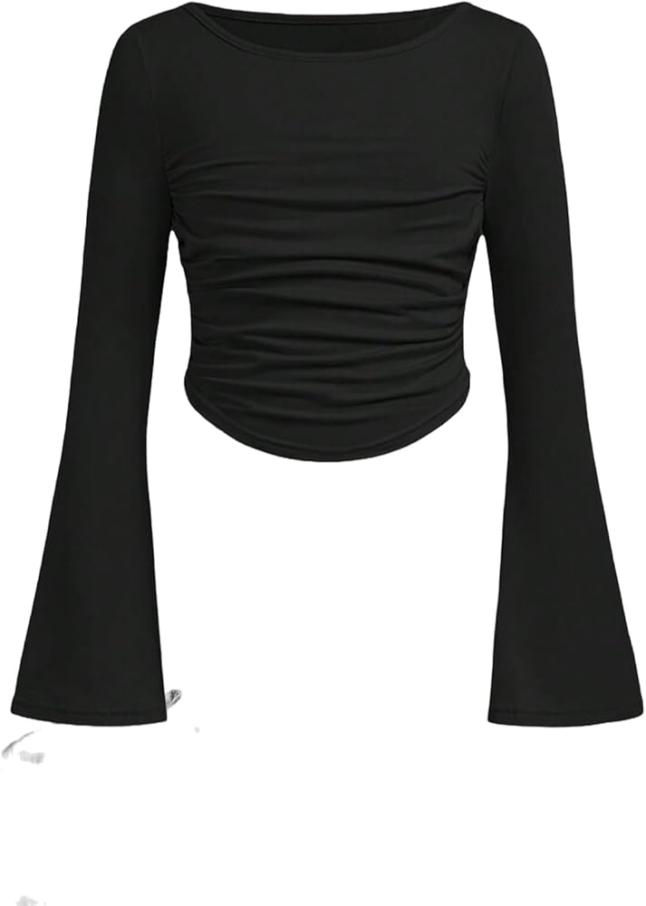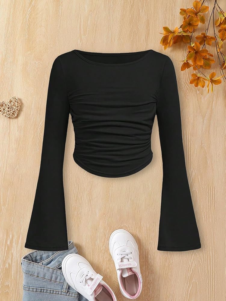 Girls casual basic top shirts feature bell sleeve, round neck, fitted, ruched, black solid color, easy to match