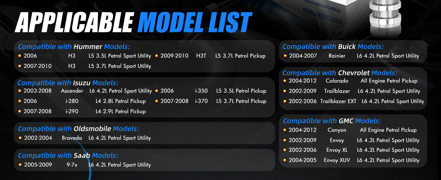 Vehicle Fitment for Hummer & Isuzu & Oldsmobile & Saab - Sorghum variable valve timing solenoid compatible with Hummer H3 2006 L5 3.5L Petrol Sport Utility, H3 2007-2010 L5 3.7L Petrol Sport Utility, H3T 2009-2010 L5 3.7L Petrol Pickup and Isuzu Ascender 2003-2008 L6 4.2L Petrol Sport Utility, i-280 2006 L4 2.8L Petrol Pickup, i-290 2007-2008 L4 2.9L Petrol Pickup, i-350 2006 L5 3.5L Petrol Pickup, i-370 2007-2008 L5 3.7L Petrol Pickup and Oldsmobile Bravada 2002-2004 L6 4.2L Petrol Sport Utility and Saab 9-7x 2005-2009 L6 4.2L Petrol Sport Utility. If you are not sure the solenoid is fit for your model, please contact us at any time.