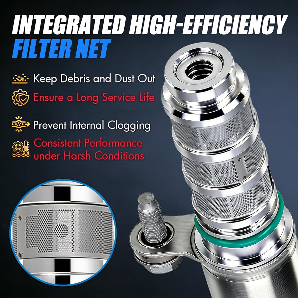 Built for Extreme Durability & Reliability - Manufactured from high-grade materials and premium rubber sealing ring, this engine variable valve timing solenoid is built to last. It features excellent resistance to heat, corrosion, and oil breakdown. The integrated high-efficiency filter net keeps debris and dust out, preventing internal clogging and ensuring a long service life with consistent performance under harsh conditions.