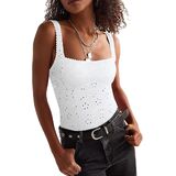 Features: Sleeveless, eyelet embroidery, picot trim, square neck, backless design, Y2k style, petite tank, scoop neck accentuates your charming curves of chest and neck, eyelet and picot trim for a touch of femme charm, double layered chest design will not be transparent, open back detail, wide shoulder straps look more elegant and chic, and they can cover bra straps, stay in place, and not slip off