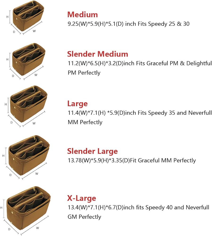 5 SIZES OF BAG ORGANIZER: Medium: 9.25(W)*5.9(H)*5.1(D) inch Fits Speedy 25 & 30.Slender Medium: 11.2(W)*6.5(H)*3.2(D)inch Fits Graceful PM & Delightful PM Perfectly. Large: 11.4(W)*7.1(H) *5.9(D)inch Fits Speedy 35 and Neverfull MM Perfectly.Slender Large: 13.78(W)*5.9(H)*3.35(D)Fit Graceful MM Perfectly. X-Large:13.4(W)*7.1(H)*6.7(D)inch fits Speedy 40 and Neverfull GM Perfectly.