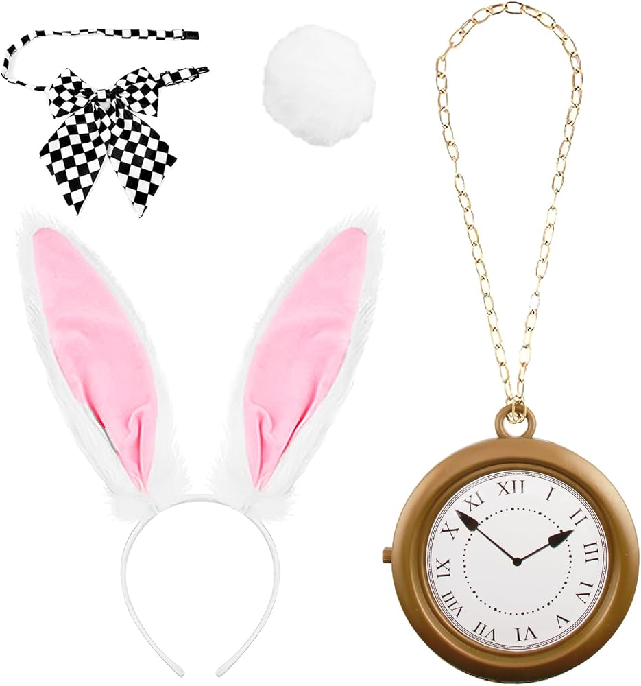 4-in-1 Bunny Costume Set with Adjustable Ears & Tail:This complete rabbit costume accessories kit includes bunny ears headband (2 soft plush styles), fluffy rabbit tail with safety pin, vintage clock necklace chain, and adjustable bow tie - perfect for white rabbit costume lovers seeking Easter bunny outfits or Halloween bunny ears looks. The bendable wire in ears allows DIY shaping from upright rabbit ears to floppy bunny styles.