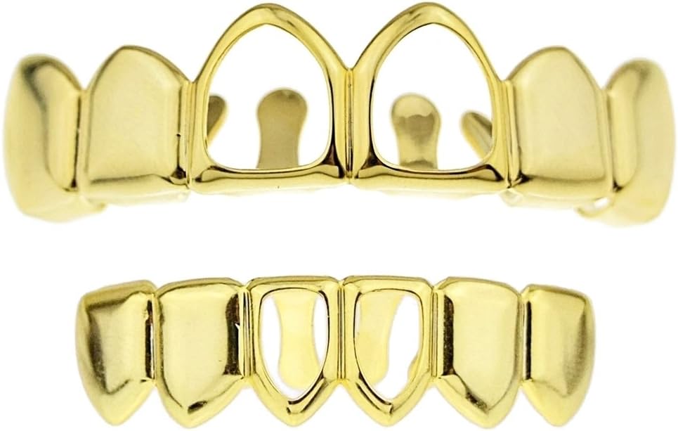 Original Best Grillz brand open face teeth grillz set for top and bottom teeth. Two open face teeth on top and two open face teeth on bottom. Dazzling 14k gold plated over brass. Silicone molding bars and easy instructions are included to mold your grillz in just a matter of minutes. These instant grillz are easily removable and reusable.