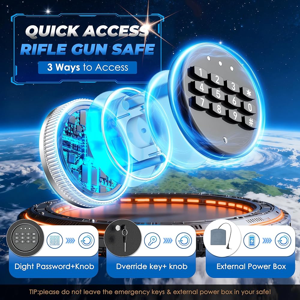 ✅【Three Ways to Open Gun Safe for Rifle and Shotguns】①Digital keyboard + Knob ②Key + Knob ③Emergency battery box + Knob, three ways to open, multiple locking system, more effective protection of firearms safety.