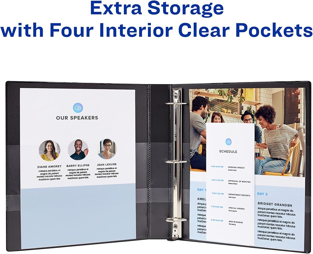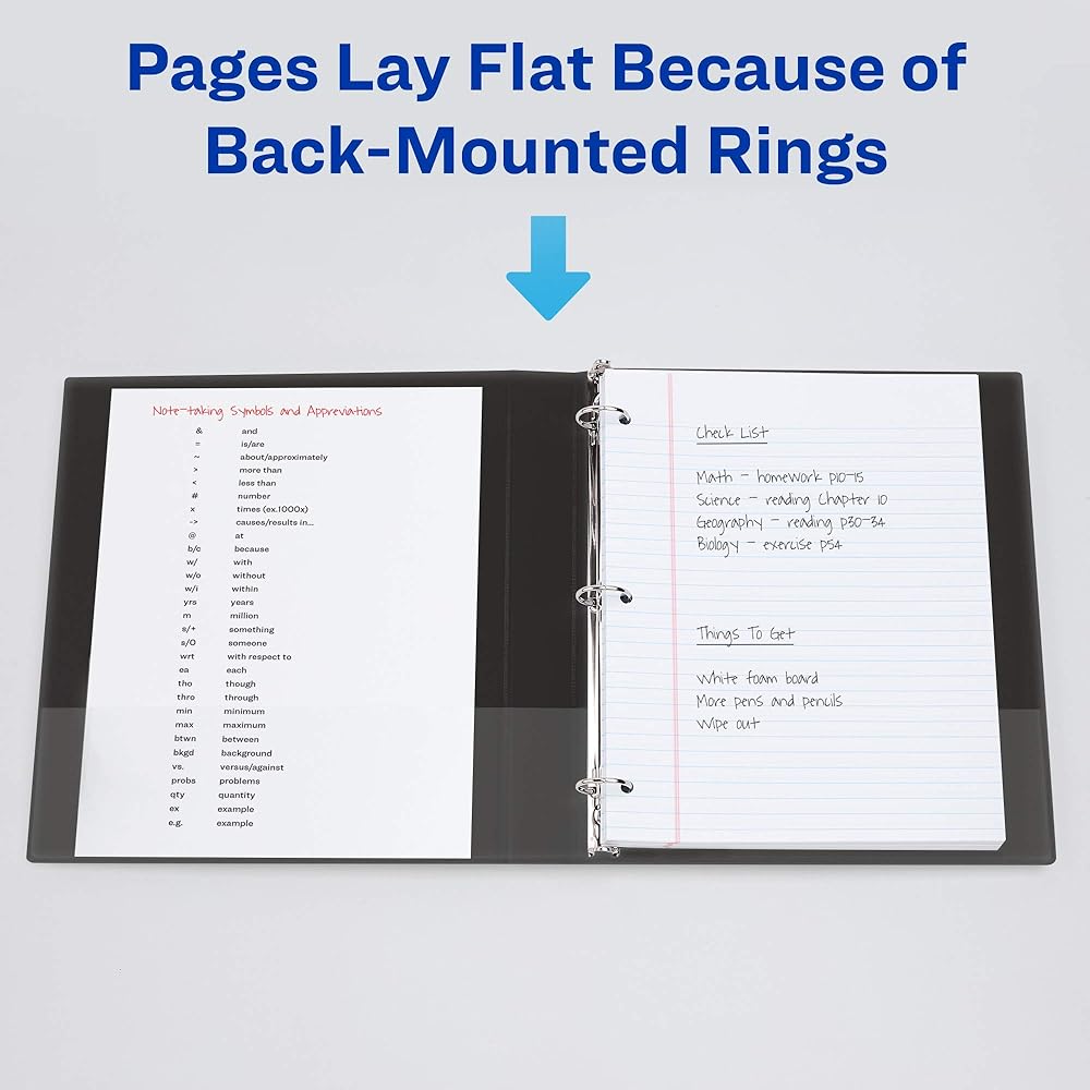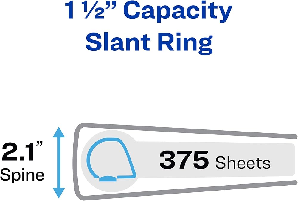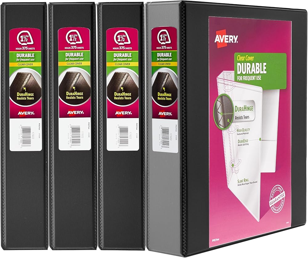 Make sure important paperwork stays with you for the long haul by storing it in an Avery Durable View Binder. This 1-1/2 inch black binder offers more protection than basic binders thanks to its tear-resistant DuraHinge spine and more flexible, DuraEdge split-resistant edges. Durable binders are also fully adhered with a deep-weave polypropylene cover that is resistant to bubbling, surface wrinkles, and is tear-resistant. The interior of this black 3 ring binder is just as impressive as its exterior. With back-mounted slant rings, your pages will never curl again. Pages lay flat and are easy to turn, while the cover opens and closes without pulling on your papers. Enjoy extra organization and storage capabilities with two interior clear pockets made of nonstick material that won't lift or transfer ink from your documents. As a school binder, this durable binder is tough enough to last the semester and then some, whether you're sticking it in your backpack every day or using it during remote learning. As a work binder, it's able to withstand frequent referencing, perfect for flipping through training materials. Have another use in mind? Durable binders are also great as recipe binders, music binders, photo albums, scrapbooks and more. For those who collect trading cards like Pokemon or Yu-Gi-Oh, pair this 3-ring binder with Avery's Trading Card Storage Sheets for effortless organization. This set includes 4 black binders. Each clear view binder holds up to 375 sheets of paper with 1-1/2 inch capacity slant rings and has a spine that is 2.1 inches wide. Rings are standard 3-hole spaced, have a secure locking mechanism, and accommodate 8.5" x 11" pages nicely. A wider front and back binder panel also ensures that standard dividers and sheet protectors are fully covered; a must for students. All Avery Durable binders are made with PVC-free material. Customize your view binder using the templates, fonts, and designs on the Avery site.
