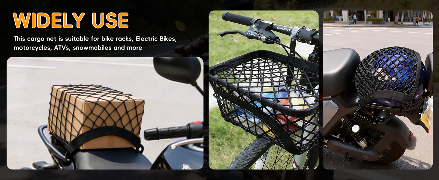【Fitment】The cargo net Compatible for motorcycles, bike racks, ATVs, snowmobiles and more.