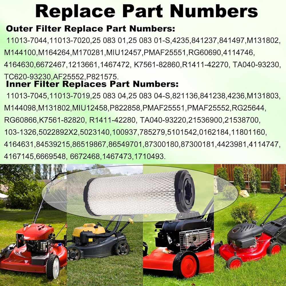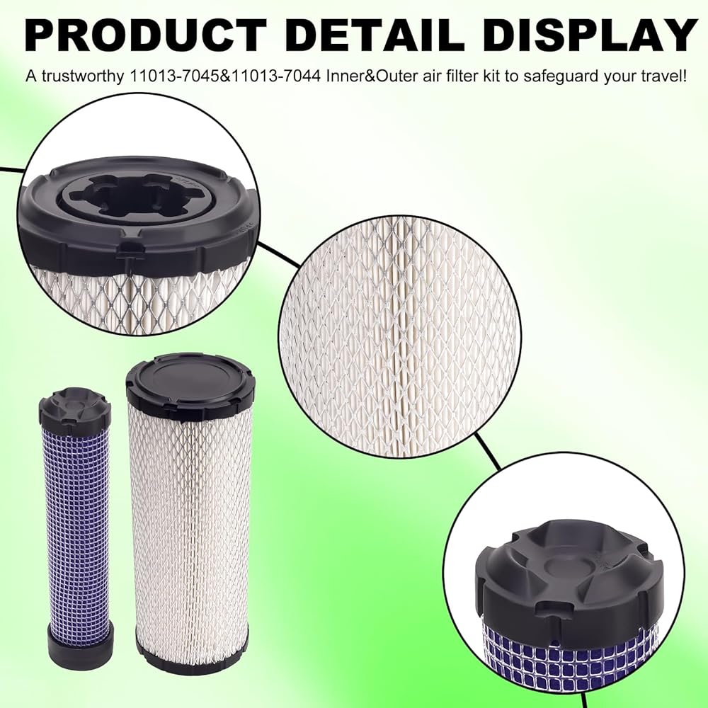 YOU WILL GET:2x 11013-7044 Outer Air Filter,2x 11013-7045 Inner Air Filter. Please carefully check your model before purchasing to ensure that the product is what you need. If you have any questions, please feel free to contact us and we will do our best to solve them for you.