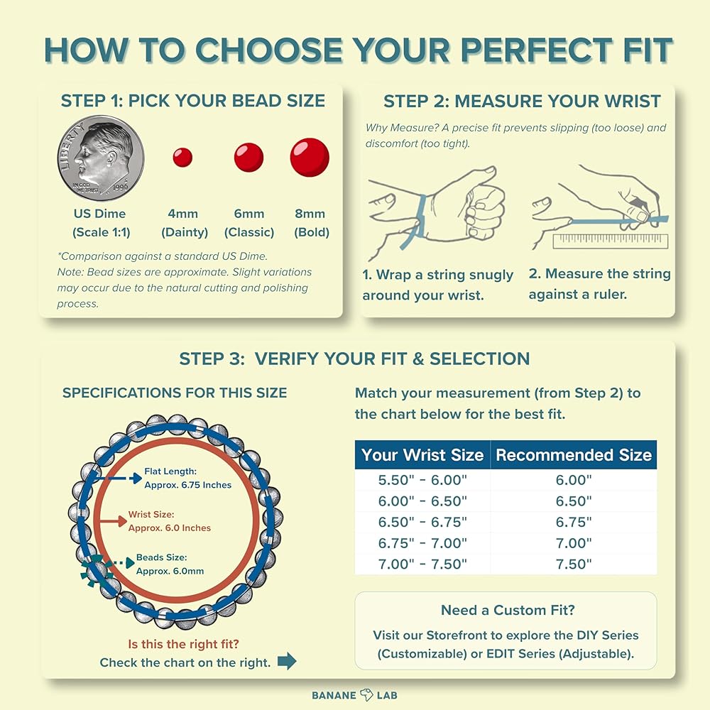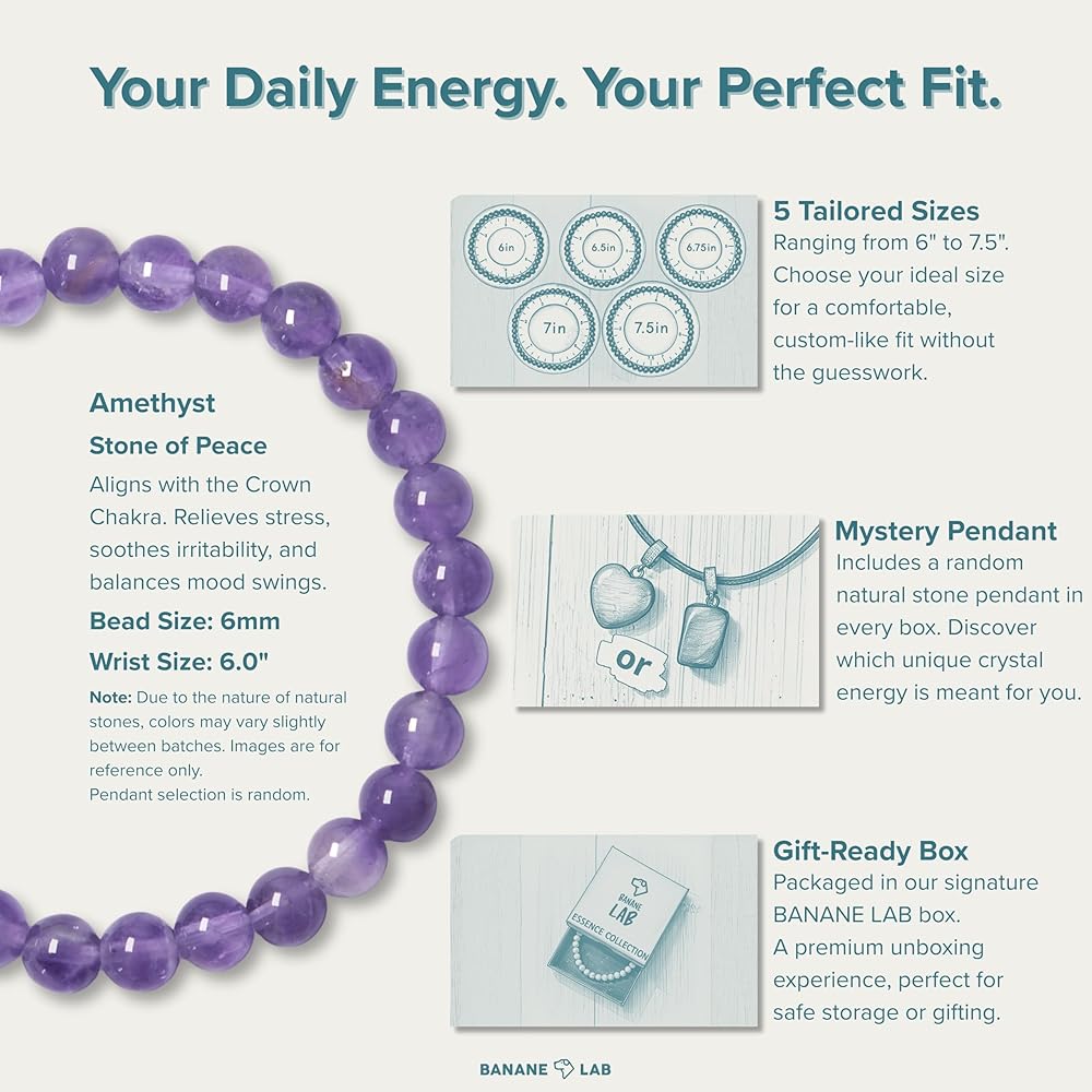 Discover Your Energy with BANANE LAB Natural Gemstone Bracelets (6mm Classic Edition) Welcome to the world of natural healing energy. At BANANE LAB, we believe that jewelry should do more than just look good—it should feel good and mean something. Our 6mm Classic Collection is designed to be your everyday companion, striking the perfect harmony between style and spirituality. Why Choose BANANE LAB 6mm Series? 1. The Perfect Balance: The 6mm bead is the ""Goldilocks"" of gemstone jewelry—not too small, not too big. It allows you to clearly see the beautiful natural textures of the Obsidian or Amethyst, yet it remains light and unobtrusive on the wrist. It is the ideal choice for first-time crystal buyers. 2. The Precise Fit Strategy: We know that a bracelet only works if you actually want to wear it. That's why we moved away from the ""one-size-fits-all"" approach. We offer multiple precise sizes based on wrist circumference (XS to XL) to ensure a comfortable, custom-like fit for both men and women. 3. The ""Mystery"" Experience: We believe in the magic of serendipity. Every single box includes a Mystery Polished Crystal Pendant. Selected at random, this extra charm might be exactly the energy you didn't know you needed. Will it be a heart-shaped Rose Quartz or a geometric Tiger Eye? The universe decides! 4. Timeless Versatility: Designed for universal appeal, the 6mm bracelet works with everything. Wear it solo for a clean, mindful look, or stack it with your watch for a touch of personality. It is a true unisex staple that complements any wardrobe. Find Your Stone: Explore our variations to find the perfect match for your spiritual journey: Need Protection? Look for our Obsidian, Tiger Eye, or Hematite options. Need Calm & Clarity? Choose Amethyst, Clear Quartz, or Blue Sodalite. Need Grounding & Strength? Select Red Jasper, Indian Agate, or Green Aventurine. (Select your preferred stone and size from the options above) Premium Gifting: Housed in our signature BANANE LAB brand box, these bracelets make a thoughtful and impressive gift for Valentine's Day, Father's Day, Christmas, birthdays, or simply to show someone you support their journey. Share the gift of positive energy and mindfulness. What's in the Box? 1 x Handmade 6mm Natural Gemstone Bracelet (Your Selected Stone & Size) 1 x Mystery Polished Crystal Pendant (Randomly Selected) 1 x Premium Brand Gift Box Handcrafted with intention. Worn with purpose.