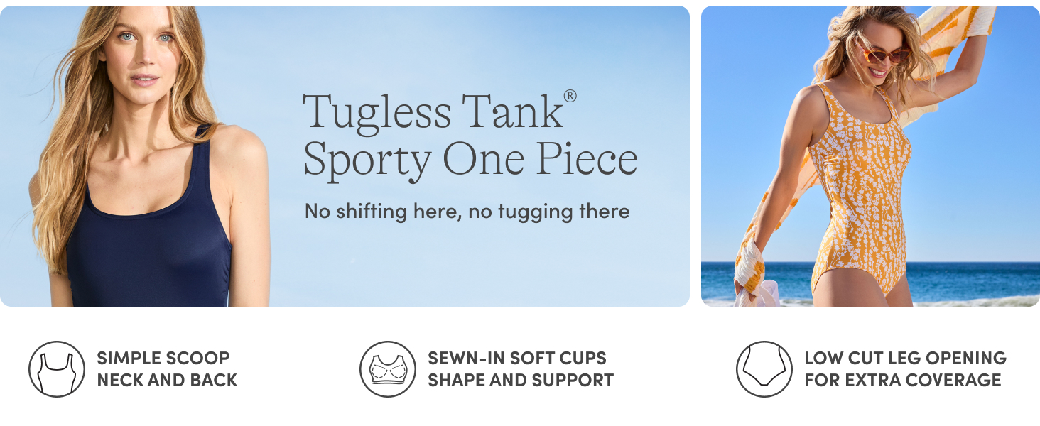 Built-In Support: Soft cup bra provides comfortable support without underwire; wide straps stay in place during movement; high scoop neckline in front and back; athletic fit with tugless design keeps this a fuss-free essential for swim workouts or casual wear