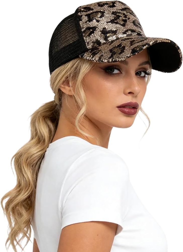 WOMEN'S SPARKLING SEQUIN LEOPARD ADJUSTABLE BASEBALL CAP SUMMER BREATHABLE SUN HAT TRUCKER HAT