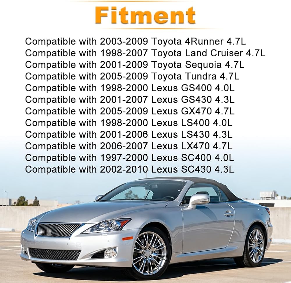 Fitment: JDMEXEV 2PCS VVT solenoid compatible with 2003-2009 Toyota 4Runner 4.7L, compatible with 1998-2007 Toyota Land Cruiser 4.7L, compatible with 2001-2009 Toyota Sequoia 4.7L, compatible with 2005-2009 Toyota Tundra 4.7L, compatible with 1998-2000 Lexus GS400 4.0L, compatible with 2001-2007 Lexus GS430 4.3L, compatible with 2005-2009 Lexus GX470 4.7L, compatible with 1998-2000 Lexus LS400 4.0L, compatible with 2001-2006 Lexus LS430 4.3L, compatible with 2006-2007 Lexus LX470 4.7L, compatible with1997-2000 Lexus SC400 4.0L, compatible with 2002-2010 Lexus SC430 4.3L