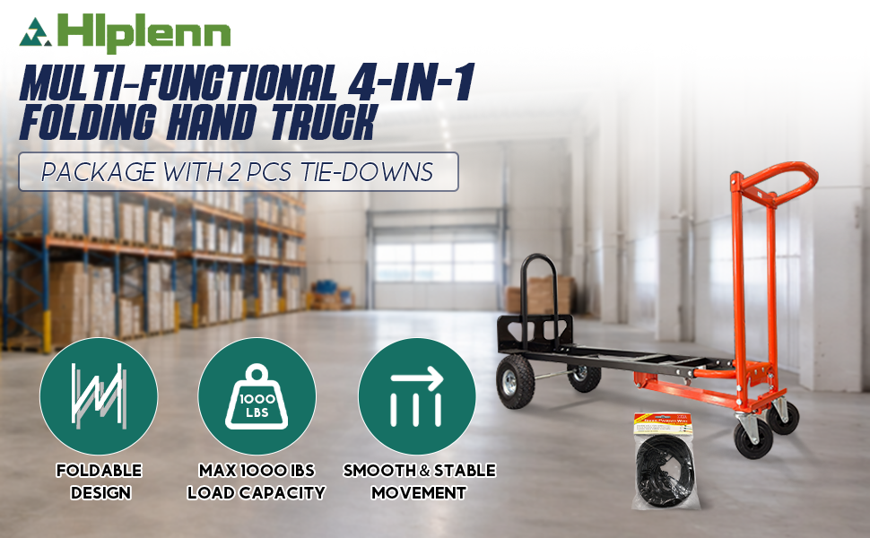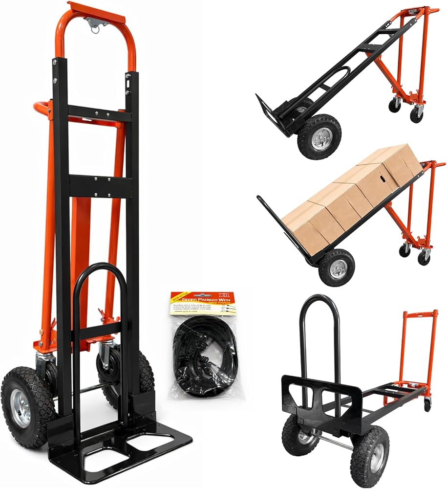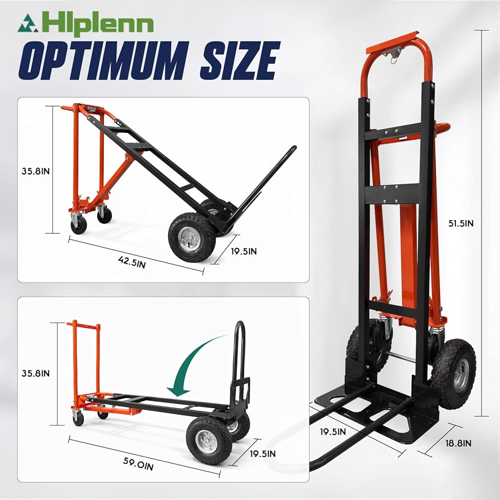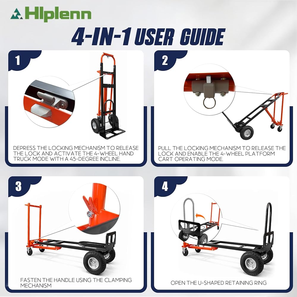 4-In-1 Convertible Design: Our convertible hand truck switches between 4 modes (dual-wheel upright/45° tilt/platform/U-shaped extension) without tools, with load capacities up to 1000 lbs, simplifying logistics, office moving and home hauling tasks