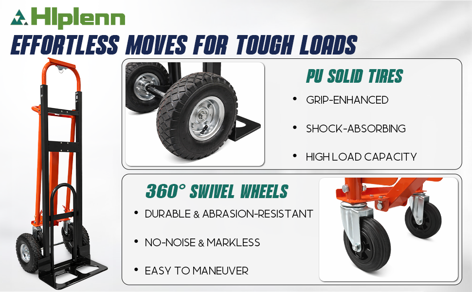 All-Terrain Tires & Swivel Casters: Equipped with 10-inch puncture-resistant wheels and 360° swivel casters, this Convertible Hand Truck glides smoothly on carpets, concrete, thresholds and uneven streets, protecting floors from scratches