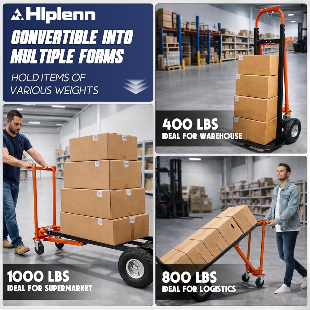 Heavy Duty Load & Durability: The heavy duty hand truck offers 400-1000 lbs capacity (varies by mode), made for heavy loads like office furniture, logistics packages or home items, reliable for frequent use in busy settings