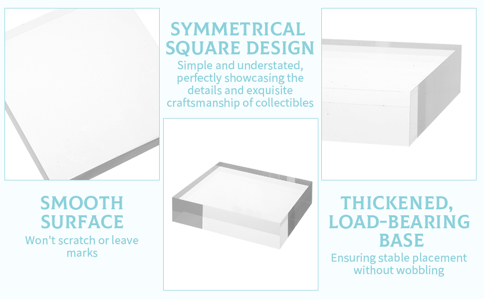 4 PCS Included: You will receive 4 clear acrylic blocks designed in a simple square shape. The sufficient quantity allows you to display items separately or create a layered arrangement, meeting different presentation needs for personal collections, retail displays, or decorative setups