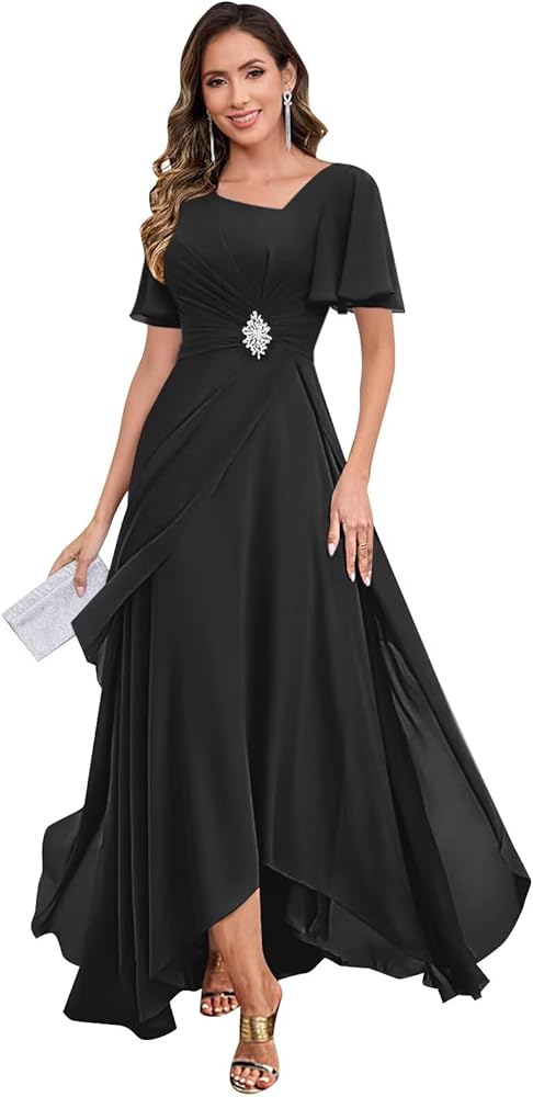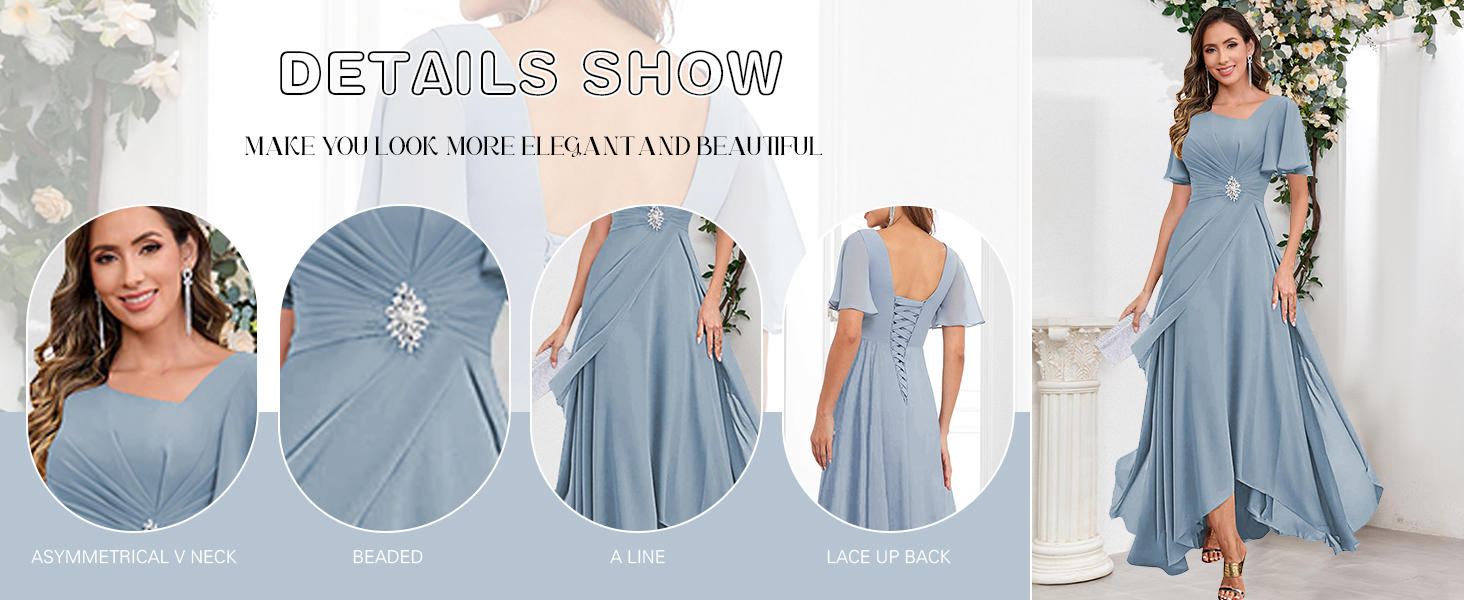 Detail: This tea length mother of the bride dress is made from high quality soft chiffon, no harm to the skin, very soft and comfortable, and features a flattering flutter sleeves; empire waist; long; asymmetrical neck; beaded; ruffles; pleated; a-line style; high low; built in bra; corset back, showcasing an elegant style, making it the perfect choice for attending any formal occasion
