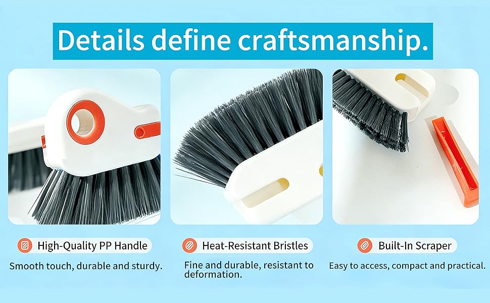 Built-in Scraper & Mini Dustpan: A handy scraper stores in the handle slot to help lift tough grime. The attached fluted dustpan allows you to collect scraped residue neatly for easy disposal.