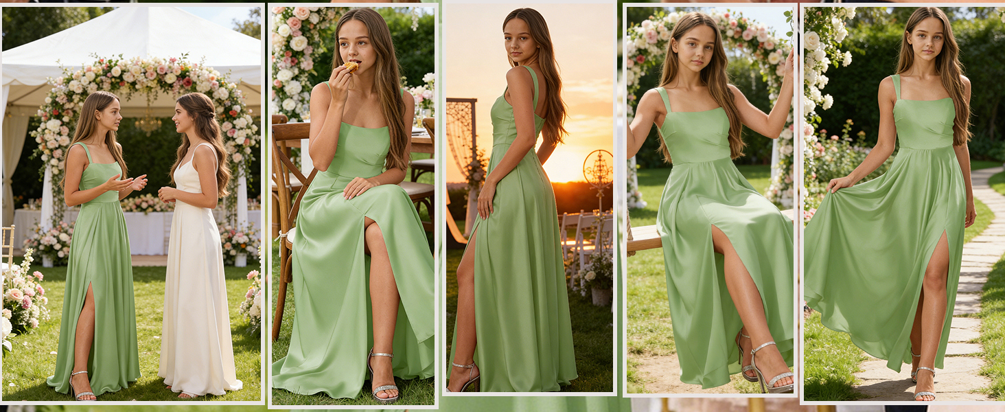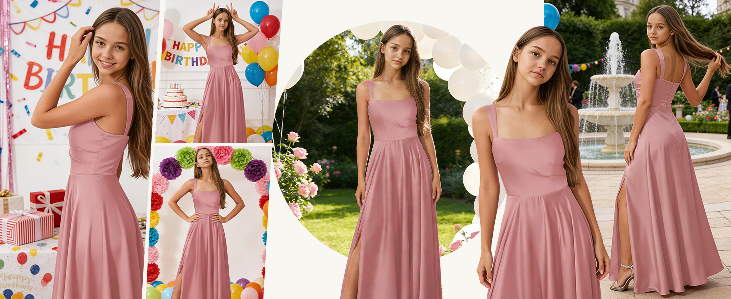 Features: The junior bridesmaid dress is made of silk satin. The upper body is designed with spaghetti strap. This is an elegant princess party maxi dress and teens' beauty wedding pageant dance gowns