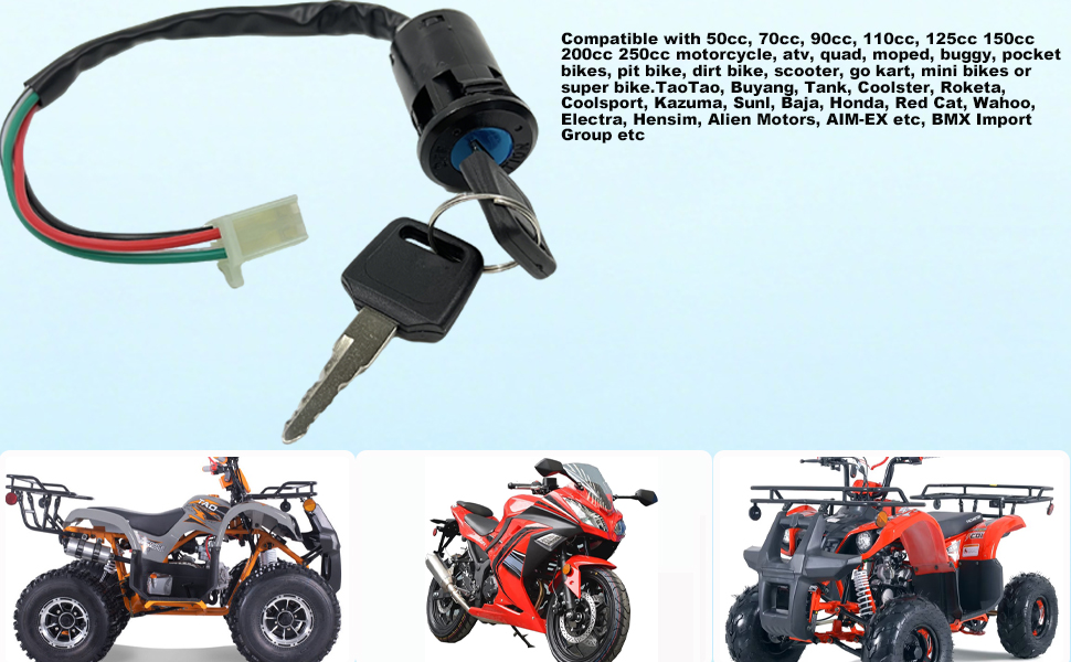 Service: We will issue refund or arrange reshipment within 24 months, if the this 50cc ignition switch key set have any quality issue, please feel free to contact us.It is used for 50cc 70cc 90cc 110cc 125cc 150cc 200cc 250cc TaoTao SUNL Chinese ATV Dirt Bike Electric Scooter.