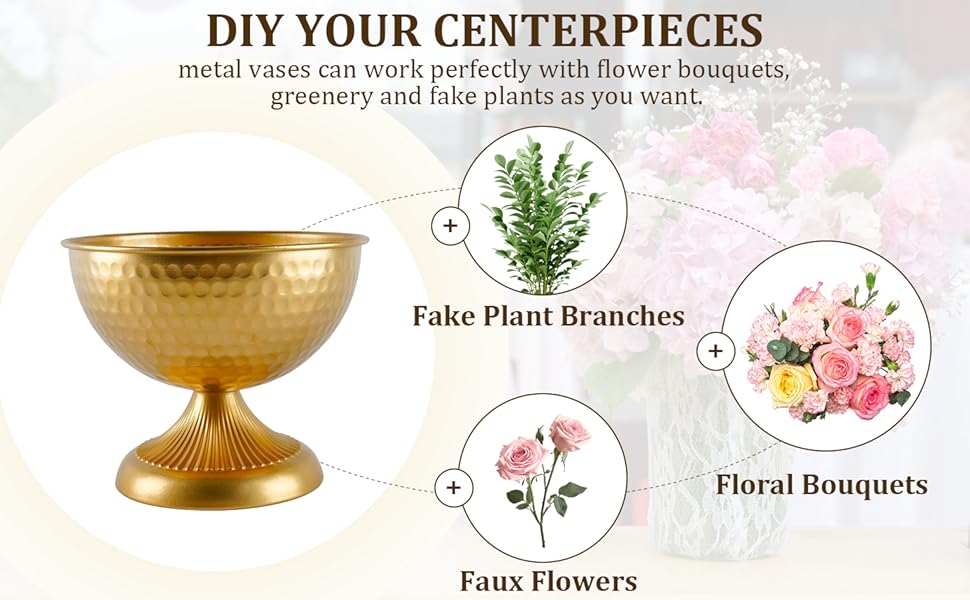 Quality & Design: Crafted from top-quality metal vase material, metal flower vases are built to last. With top diameter of 7.3 in, wide opening of flower vases is flexible to arrange flowers for wedding centerpieces (Cannot Hold Water)
