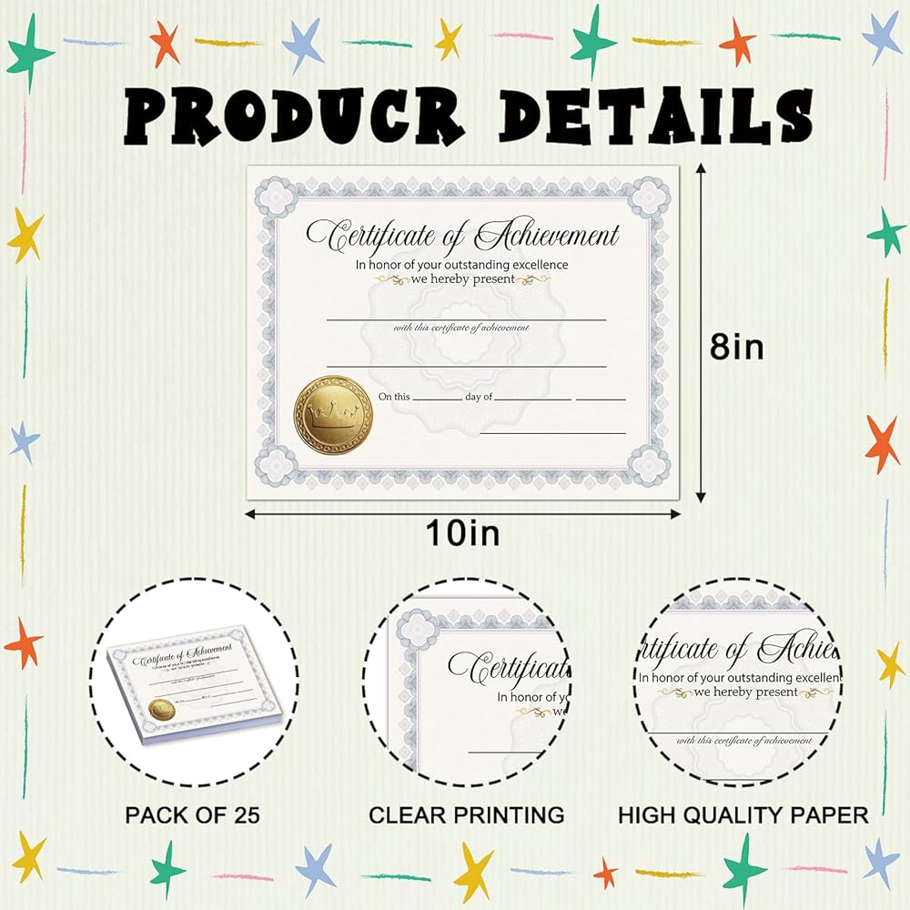Certificate Quantity: You will receive 25 achievement certificate cards with exquisite designs