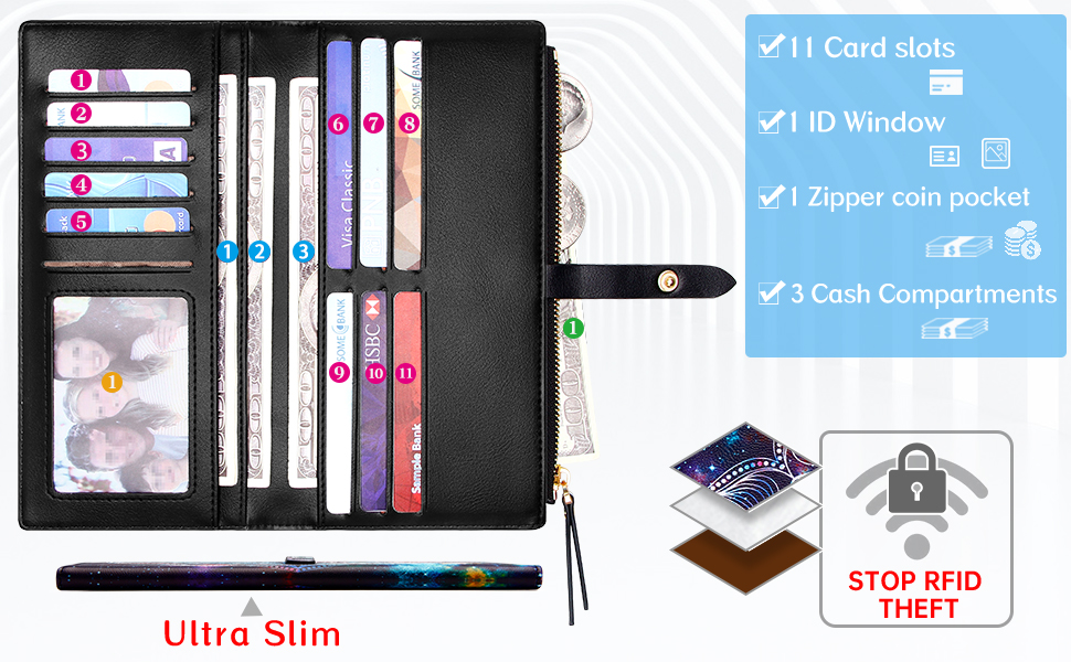 PRACTICAL & VERSATILE: Our women ultra thin wallet comes with 11 credit card slots, 1 clear ID window, 3 currency/bill/checkbook compartments, 1 side zipper pocket for change/coins, slim zipper wallet, suit for shopping or travel, and enough for daily use.