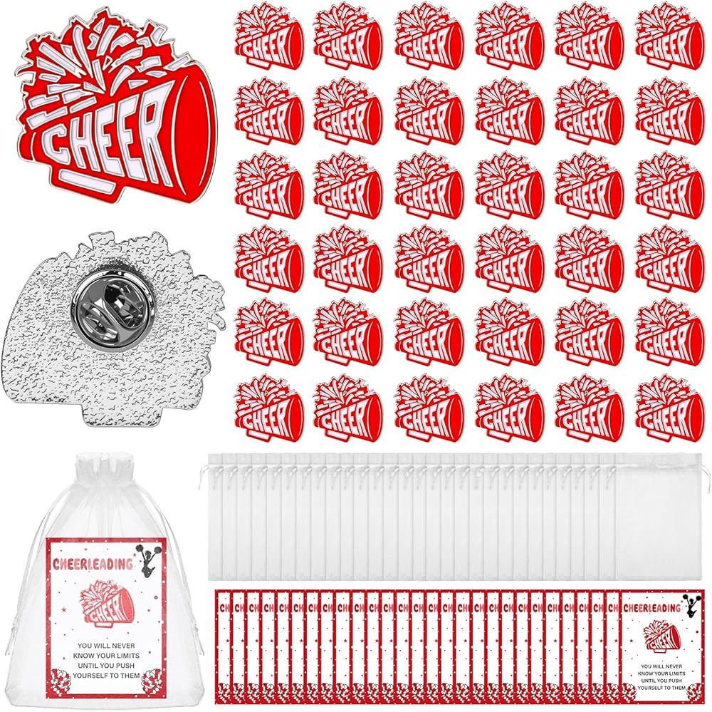 Add a spirited touch to your team celebrations with these delightful cheer megaphone enamel pins! This comprehensive set includes 36 pieces of beautifully crafted red and white enamel pins, each featuring a classic megaphone design with 'CHEER' text. Perfect for cheerleading squads, team events, or spirit week activities, these pins come individually packaged in organza bags with accompanying cards, making them ready for gifting. The pins serve as wonderful accessories for cheerleaders, team supporters, or anyone wanting to show their spirit. Their versatile size makes them ideal for decorating backpacks, jackets, or collecting on display boards. These cheerleading pins make excellent party favors, goodie bag stuffers, or thoughtful gifts for team members. Whether you're organizing a cheerleading event, planning team recognition, or looking for special accessories for your squad, these enamel pins deliver both style and spirit in one complete package.