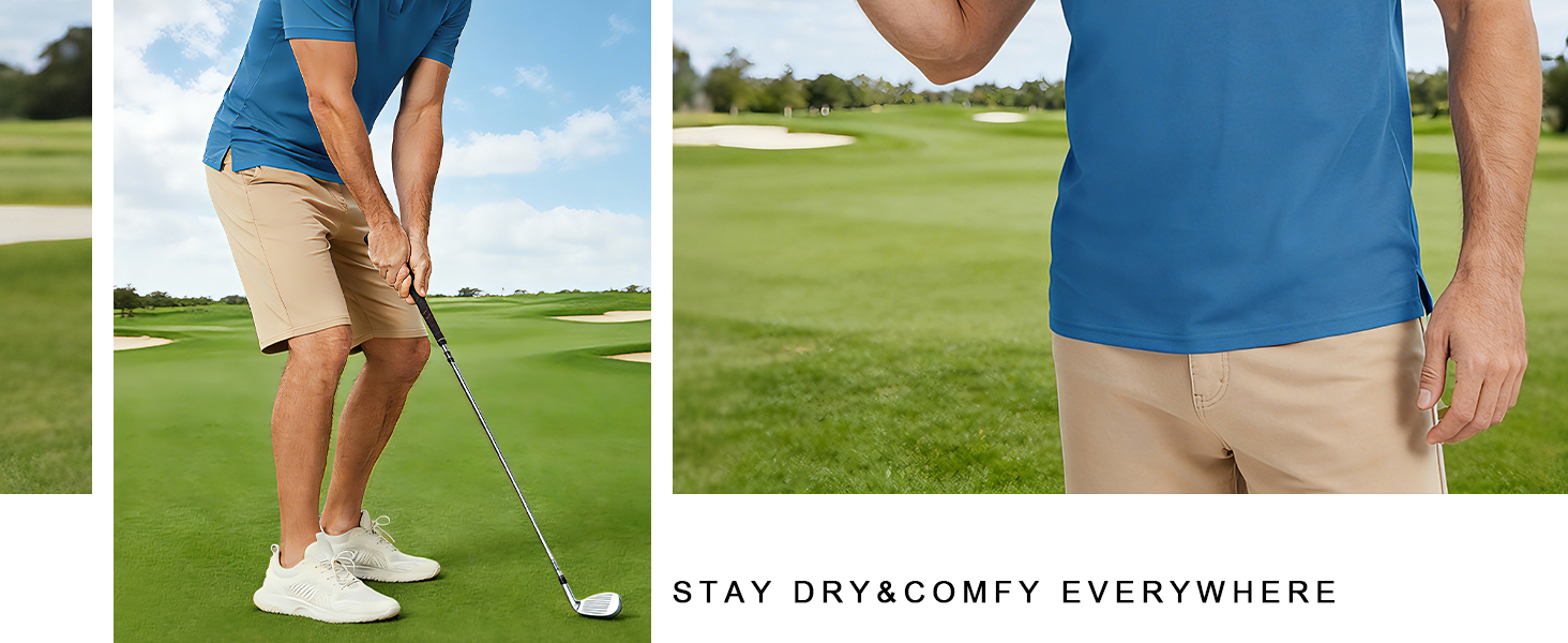 【PREMIUM 4-WAY STRETCH FABRIC】 Crafted from a high-performance blend of 97% Polyester and 3% Spandex. This pique jersey fabric provides ultimate flexibility and 4-way stretch, allowing for a full range of motion during your backswing. Lightweight, breathable, and designed for an athletic fit that doesn't restrict.