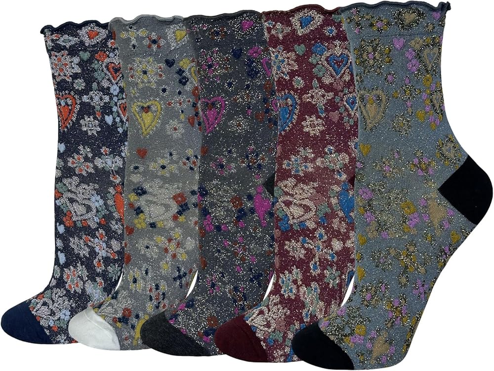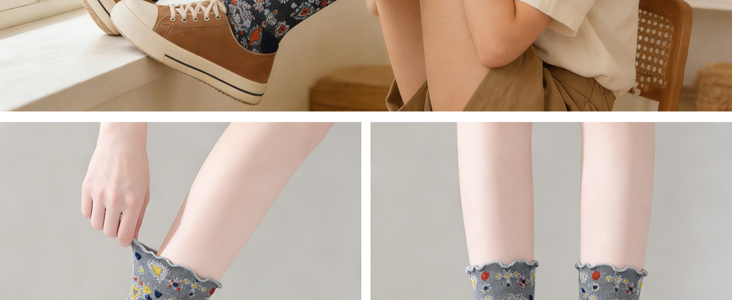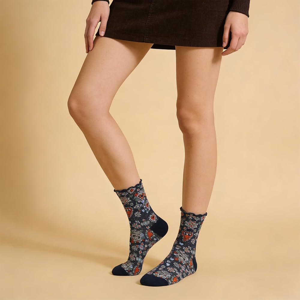 【Vintage-Inspired Frilly Crew Socks】 Crafted with a delicate floral pattern, these cute vintage crew socks for women blend timeless charm with feminine style. Designed with a classic ruffle cuff, they offer a cute, vintage look that adds a touch of retro elegance to your everyday outfit