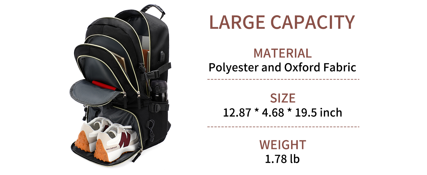 Large Capacity: External dimensions are 14.04”(L)×2.15”(W)×20.28”(H), Capacity: 36L. The separate padded laptop compartment fits up to 17 inch laptop and is suitable for both women and men. Easily holding 3-5 days of outfits. Is perfect for short business trips or weekend getaways,eliminating the need for extra luggage and enhancing travel efficiency