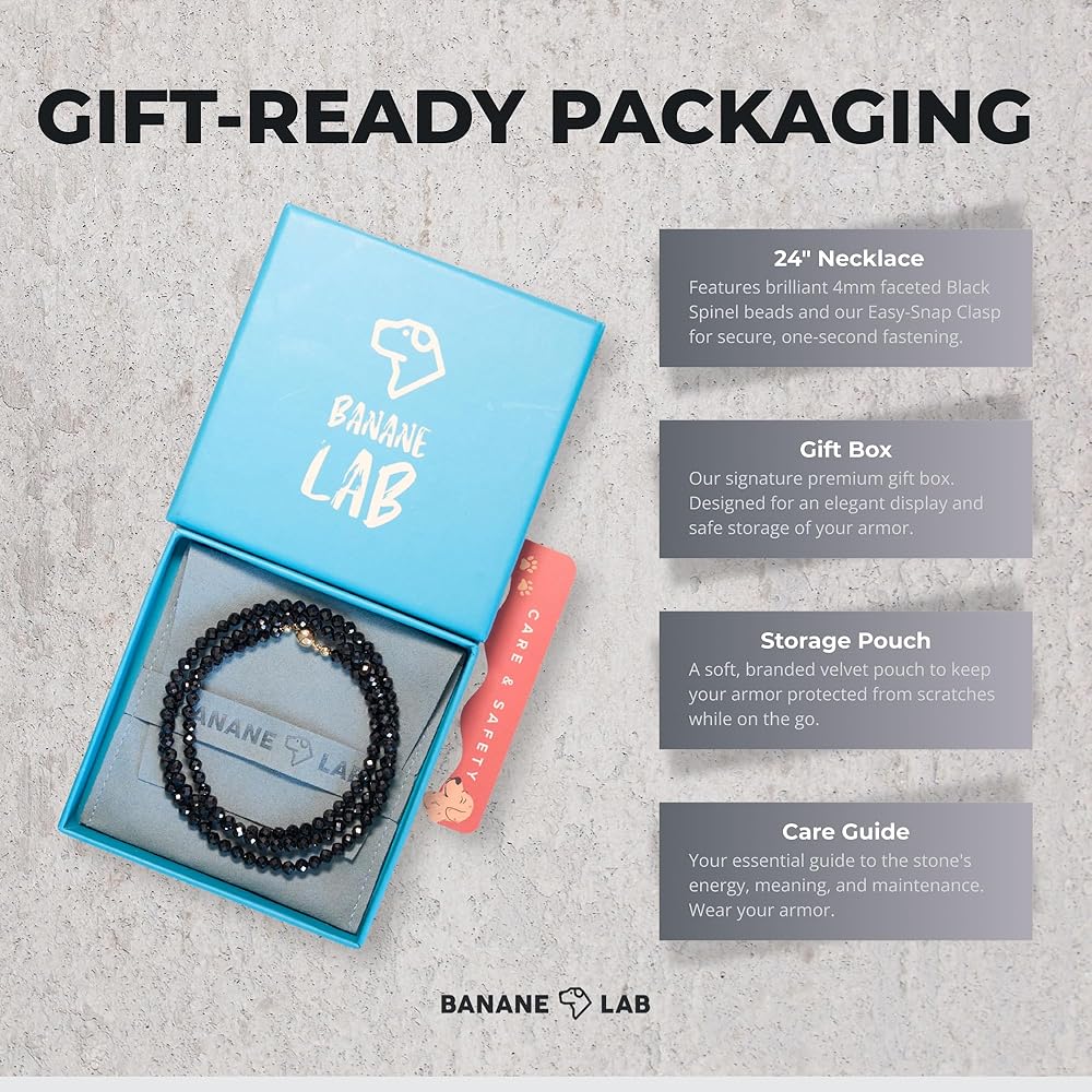 Discover the understated power of the BANANE LAB No.4 Men's Necklace, a piece that bridges the gap between athletic streetwear and sophisticated luxury. Crafted from 100% Natural Black Spinel, this necklace is designed for the modern man who values authenticity. Unlike glass or onyx, our gemstone beads possess a high refractive index, offering a sharp, diamond-like sparkle that commands attention. The 4mm faceted beads are strung on a specialized flexible steel wire, ensuring the necklace retains a fluid, liquid-like drape that moves naturally with your body. Sized at a perfect 24 inches, it creates a relaxed Baseball Style look ideal for a t-shirt, yet is versatile enough to be wrapped around the wrist as a layered gemstone bracelet that slides seamlessly under a suit cuff. We finished it with a 14K Gold Plated Easy-Snap Clasp for effortless, 1-second wear. More than just jewelry, Black Spinel is renowned as a powerful stone of protection and revitalization. Just as it shields you from negativity, treat this real stone armor with care, and it will maintain its shine for years. Delivered in a signature BANANE LAB gift box, it is the ultimate energy gift for him—combining cool style with positive vibes for Christmas, birthdays, or anniversaries.
