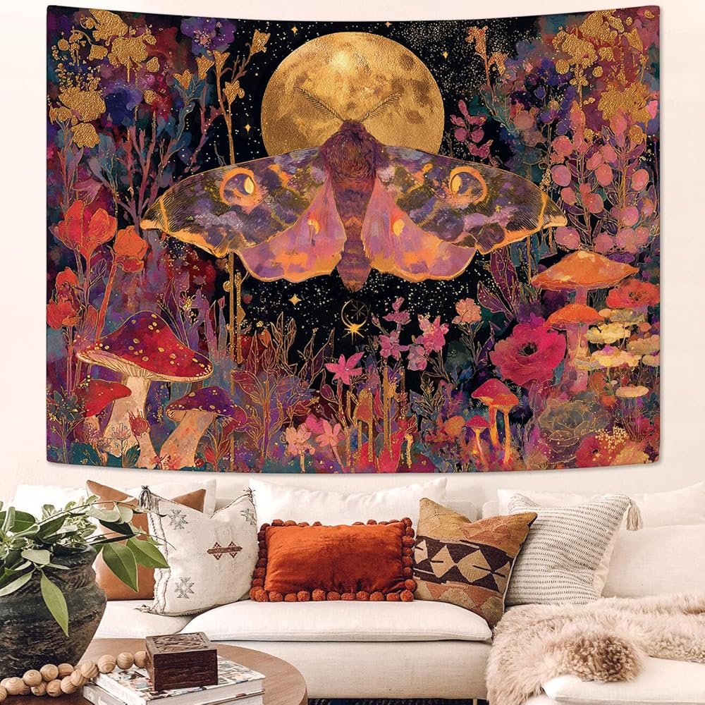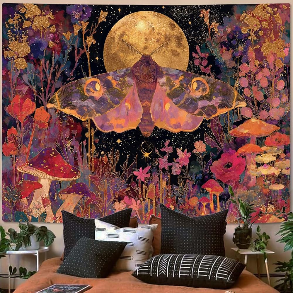 【Boho Watercolor Design】 Features an ethereal Moth beneath a Golden Moon, framed by Red and purple Flower patterns, rendered in a unique Watercolor style.