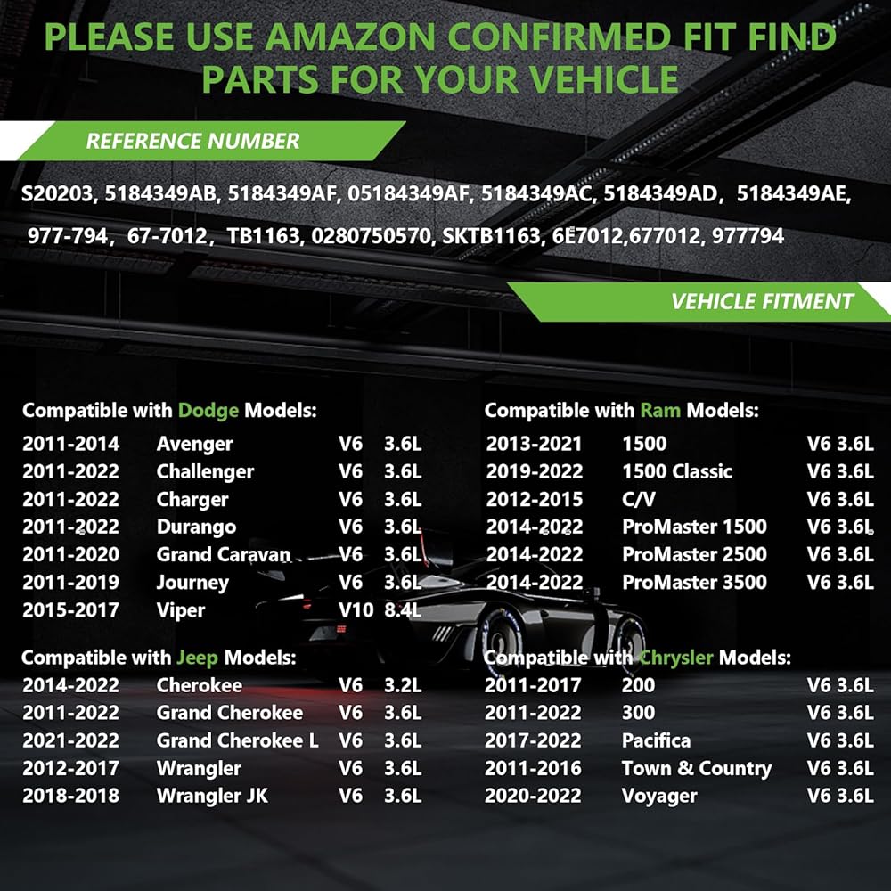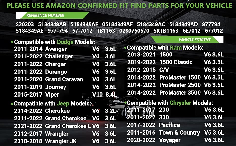 [Vehicle Fitment]:Compatible with Dodge:2011-2014 Avenger, 2011-2022 Challenger, 2011-2022 Charger, 2011-2022 Durango, 2011-2020 Grand Caravan, 2011-2019 Journey, 2015-2017 Viper,, Compatible with Chrysler:2011-2017 200, 2011-2022 300, 2017-2020 Pacifica, 2011-2016 Town & Country,, Compatible with Jeep:2014-2022 Cherokee, 2011-2022 Grand Cherokee, 2012-2017 Wrangler, 2018 Wrangler JK,, Compatible with Ram:1500 1500 Classic C/V ProMaster 1500 ProMaster 2500 ProMaster 3500