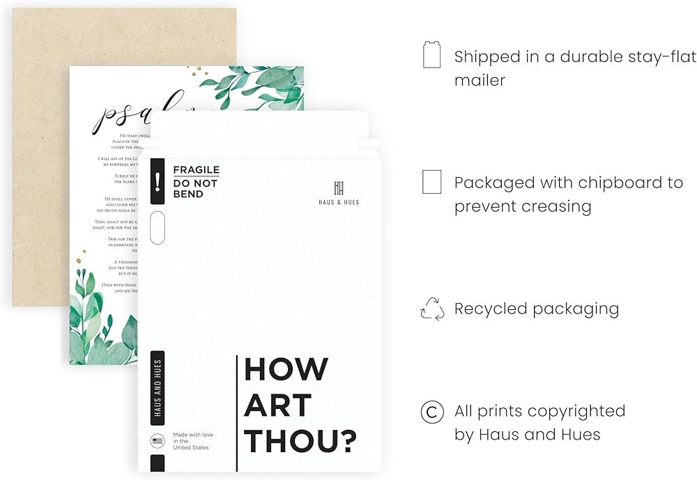 MADE IN THE USA: To achieve the quality we're known for, we use a giclée printing technique on 270 GSM solar white linen paper. The recycled paper used for our Christian wall decor is sustainably-sourced in the US, and our inks are water-based and toxic-free. Bible verse wall decor is shipped in a durable mailer to protect the artwork while in transit. Chipboard pads in the packaging prevent any creases and dents so your scripture wall decor arrives in perfect condition