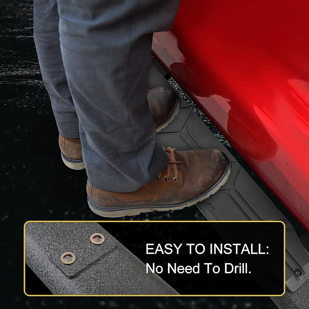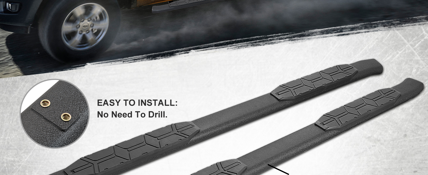 MATERIAL: The Nerf Bars Made with Heavy-Duty Carbon Steel. The Surface of The Step Bar Is Rust-proof Dual-stage Textured Black Powder. This Is More Rust-proof and Sturdier Than Ordinarily Crafted Steps. Maximum Load Capacity 450LBS.
