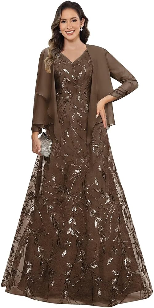 Detail: This dress consists of a sparkly sequined sleeveless dress and a chiffon long sleeve jacket. The dress's hem is flowing and lightweight, and the sequin decorations make you shine brilliantly with every step you take, showcasing an elegant style, 2 pieces; v neck; a line; built in bra; zipper back, making it the perfect choice for attending any formal occasion