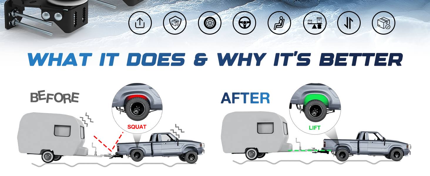 ADJUSTABLE AIR SPRINGS FOR A COMFORTABLE RIDE: The adjustable air springs allow you to fine-tune air pressure from 5 to 100 psi, offering shock absorption and a smoother ride over rough terrain. Whether towing a trailer or carrying a heavy load, this load leveling system improves ride comfort and prevents bottoming out