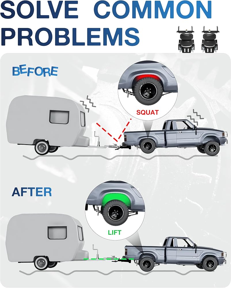 ENHANCED LOAD STABILITY & SUPPORT: This air suspension kit is designed to provide up to 5,000 lbs of load leveling support, ensuring a stable and balanced ride while towing or hauling heavy loads. It enhances vehicle stability, handling, and braking performance, preventing suspension sagging and reducing strain on your truck's frame