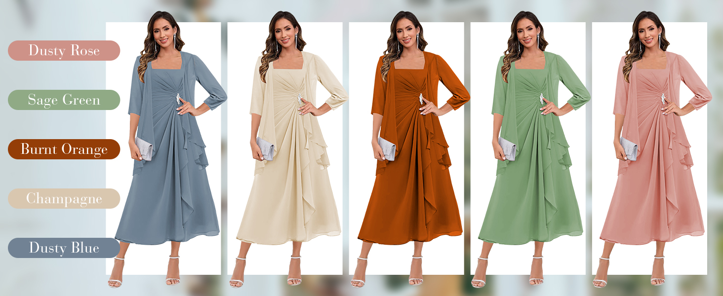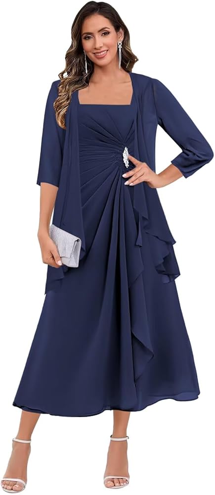 Vvecz 2 Pieces Tea Length Mother of the Bride Dresses with Jacket Chiffon Long Sleeve Evening Formal Dress