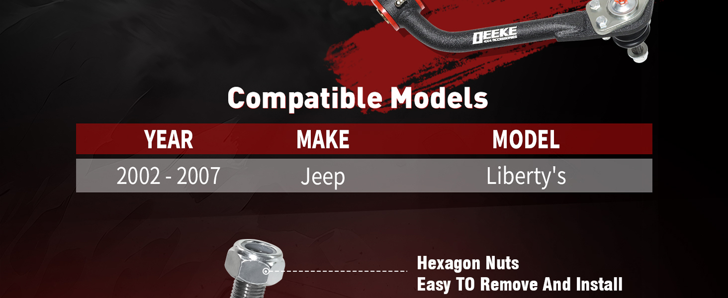 Vehicle Compatibility:Front upper control arms compatible with 2002–2007 Jeep Liberty KJ. (Please note: during installation, the grease fittings must face upward)