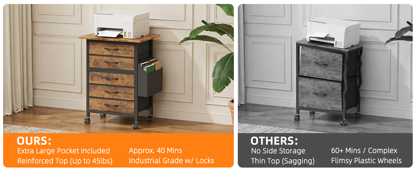 【Say Goodbye to Clutter with Smart Side Storage】Tired of losing small office tools? Our unique side storage pocket design offers extra space for notebooks, pens, and tablets. Combined with 5 spacious drawers, this file cabinet maximizes every inch of your office storage, solving the common "lack of space" complaint found in standard cabinets