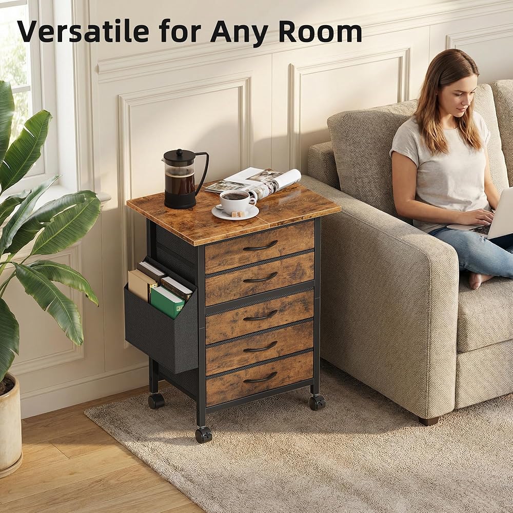 Rolling File Cabinet with Side Pocket, 5 Drawers Filing Cabinet for Home Office, Printer Stand with Storage, Wood Top Office Storage Cabinet for Documents and Crafts, Rustic Brown, 15" D