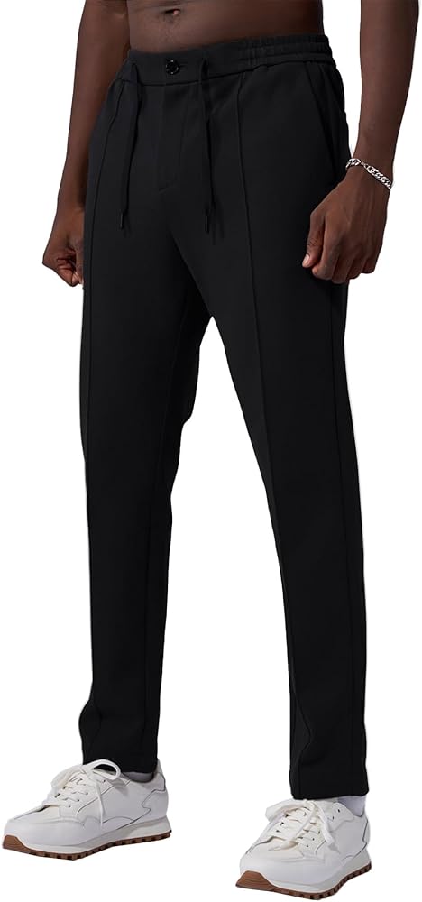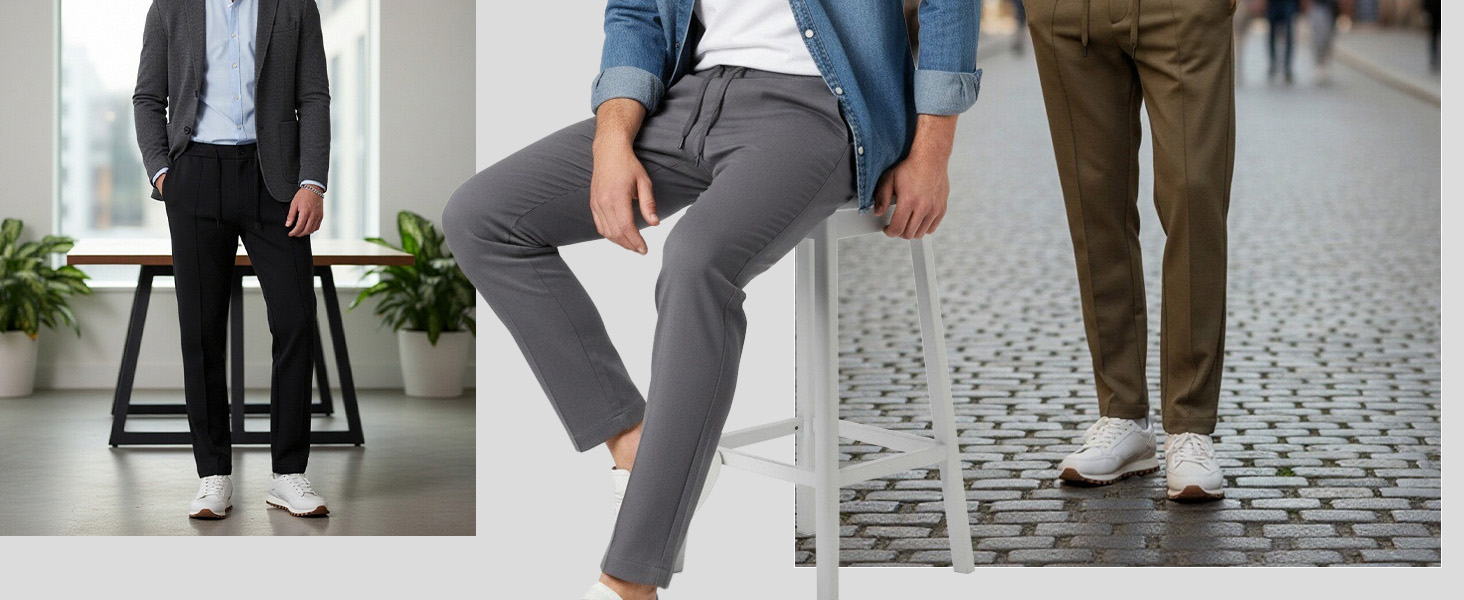 Product Features: Experience the modern slim fit of these mens casual pants, designed to flatter all body types. They feature an adjustable drawstring and side elastic waist for a customizable fit. With two side pockets and a back pocket, they offer everyday convenience for casual, work, and outdoor activities.