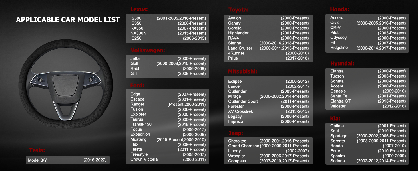 -Universal Fit for Most Vehicles: Designed to fit 14.5-15 inch steering wheels, compatible with a wide range of popular models including Tesla, Ford, Toyota, Honda, Chevrolet, and more from 2000-2027, ensuring easy installation without tools for sedans, SUVs, trucks, and crossovers.
