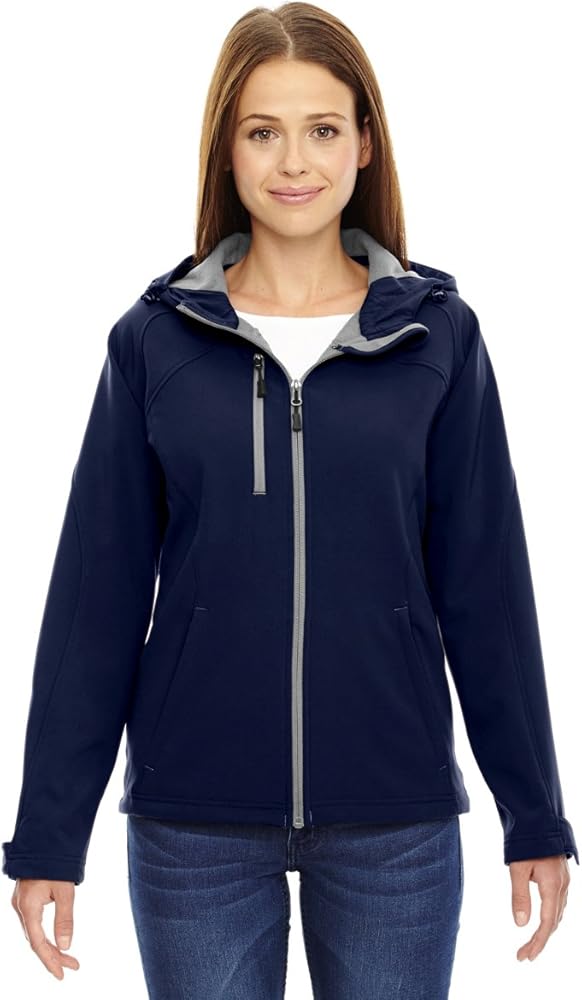 Water-repellent finish, 96% polyester/4% spandex bonded w/100% polyester anti-pill fleece, 2-layer performance stretch soft shell, 7.5 oz./yd2 255 gsm, UTK 1 temperature range, 43°F to 13°F / 6°C to -11°C, attached hood and fleece chin guard, front yoke with asymmetrically styled seams, right chest pocket with contrast reverse coil zipper, contrast reverse coil zipper at center front, articulated raglan sleeves, adjustable cuffs with tabs, two lower concealed pockets with contrast coil zippers, audio port access through lower left pocket, thermal retention shockcord at hood and hem.