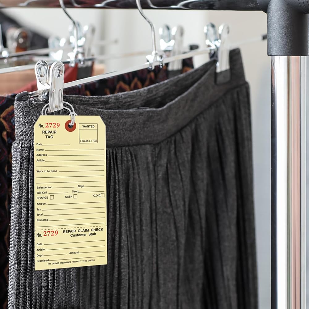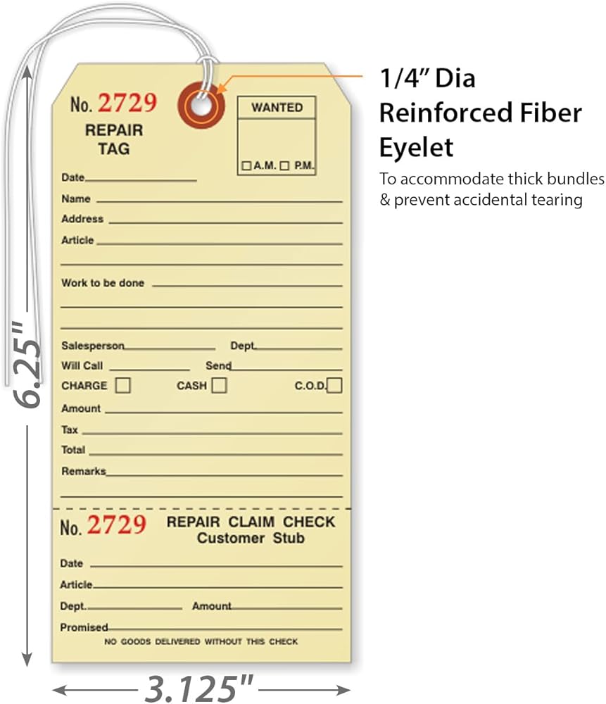 - PACK CONTENTS. Pack includes 500 sequentially numbered repair tags with stubs and pre-attached strings.