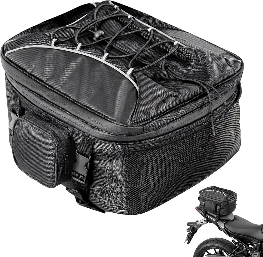 EXPANDABLE LARGE CAPACITY : Motorcycle tail bag can be expandable to 34 Liter. Size: 15.4"L x 12.2"W x 7"H Standard / 15.4"L x 12.2"W x 11.8"H Expanded.23L-34L Large storage room for carrying clothes, shoes, helmet, Ipad, and lunch. Compatible for most motorcycle models such as NOTE: Doesn't fit dirt bike and bicycle