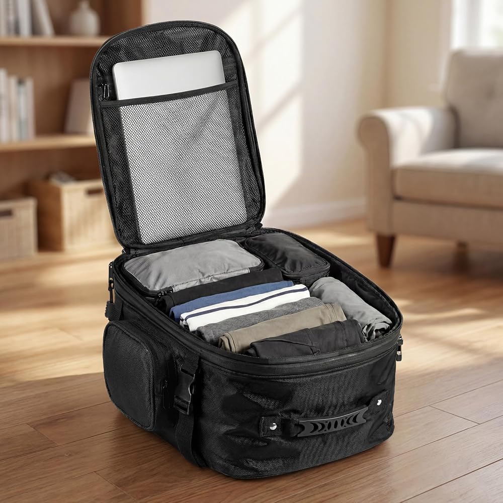 PRACTICAL AND VERSATILE LAYERED POCKET CONFIGURATION: Quick Access from backpack side pocket for store wallet, keys, cigarette, goggle keys, phones, and headphones, umbrella; A main internal mesh bag for store Ipad, gloves, lunch; 22L-34L Expandable Large Capacity for store luggage, camera, and can store full helmet, half helmet, racing helmet.