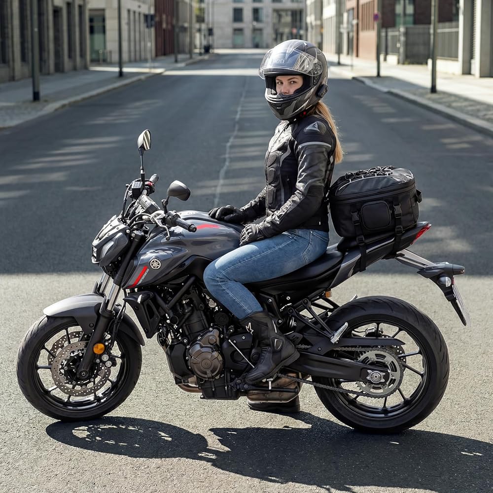 STYLISH AND EASY TO INSTAL: Easy to install the motorcycle seat bag on your motorbike with straps.Designed with reflective striping for visibility, this stylish bag is easy to attach securely to your motorcycle, providing both functionality and an added aesthetic touch.